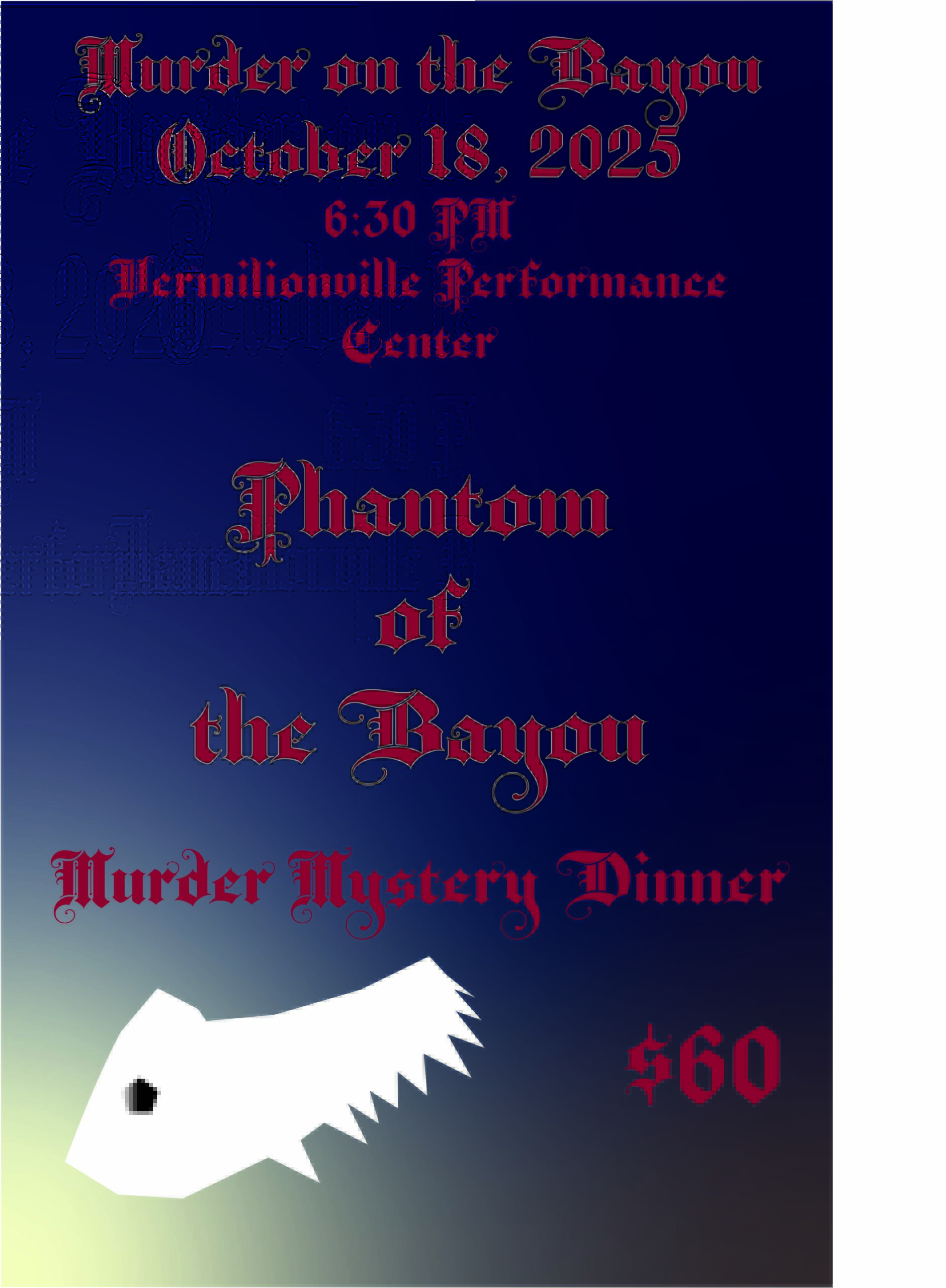 PLEASE NOTE: ONLINE TICKETING HAS ENDED. IF YOU STILL WOULD LIKE TO PURCHASE TICKETS, CALL 337-233-4077 X205, OR EMAIL COMMUNICATIONS@BAYOUVERMILIONDISTRICT.ORG AND WE'LL TAKE CARE OF YOU. THERE WILL BE NO TICKETS SOLD AT THE DOOR. Come enjoy Phantom on the Bayou, a gala unlike anything you’ve ever experienced – Danger! Secrets! Exhilaration! Opera! Death! And it’s up to you to unravel the mystery. Dress the part, collect the clues, talk to the suspects and make sure YOU aren’t the next victim! A Special Ghastly Murder Mystery Dinner Join Us for Frightening Fun!! You can sleuth by yourself or have more fun in a group! Enjoy a Three-Course Dinner by La Cuisine de Maman Games, Costumes, Prizes, Special Adult Beverages Doors open at 6 PM, dinner at 6:30. Costume Contest, Haunted History Tickets $60 Adult Themes
